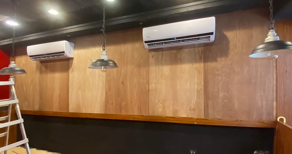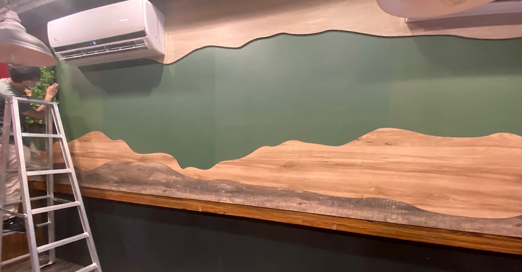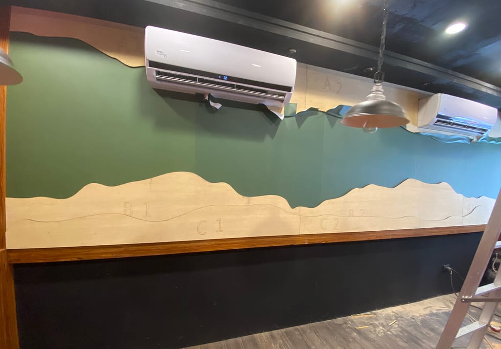 這是一間美式餐廳的牆面,空白了四五年,老闆開玩笑說終於籌到錢可以佈置了