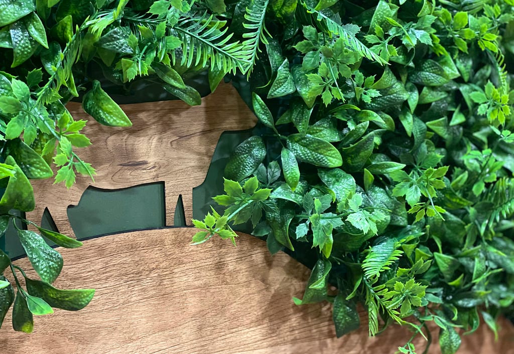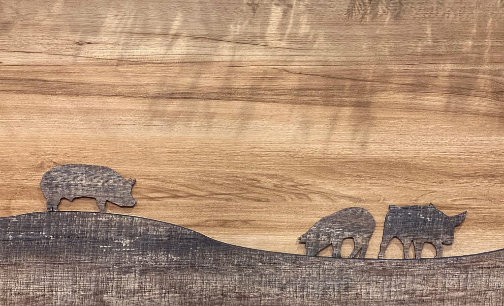 利用植物綠為主題 上下加了裁型後的木板 下方兩片木板堆疊化作山丘 山下有牛豬的剪影 形成一幅山景圖