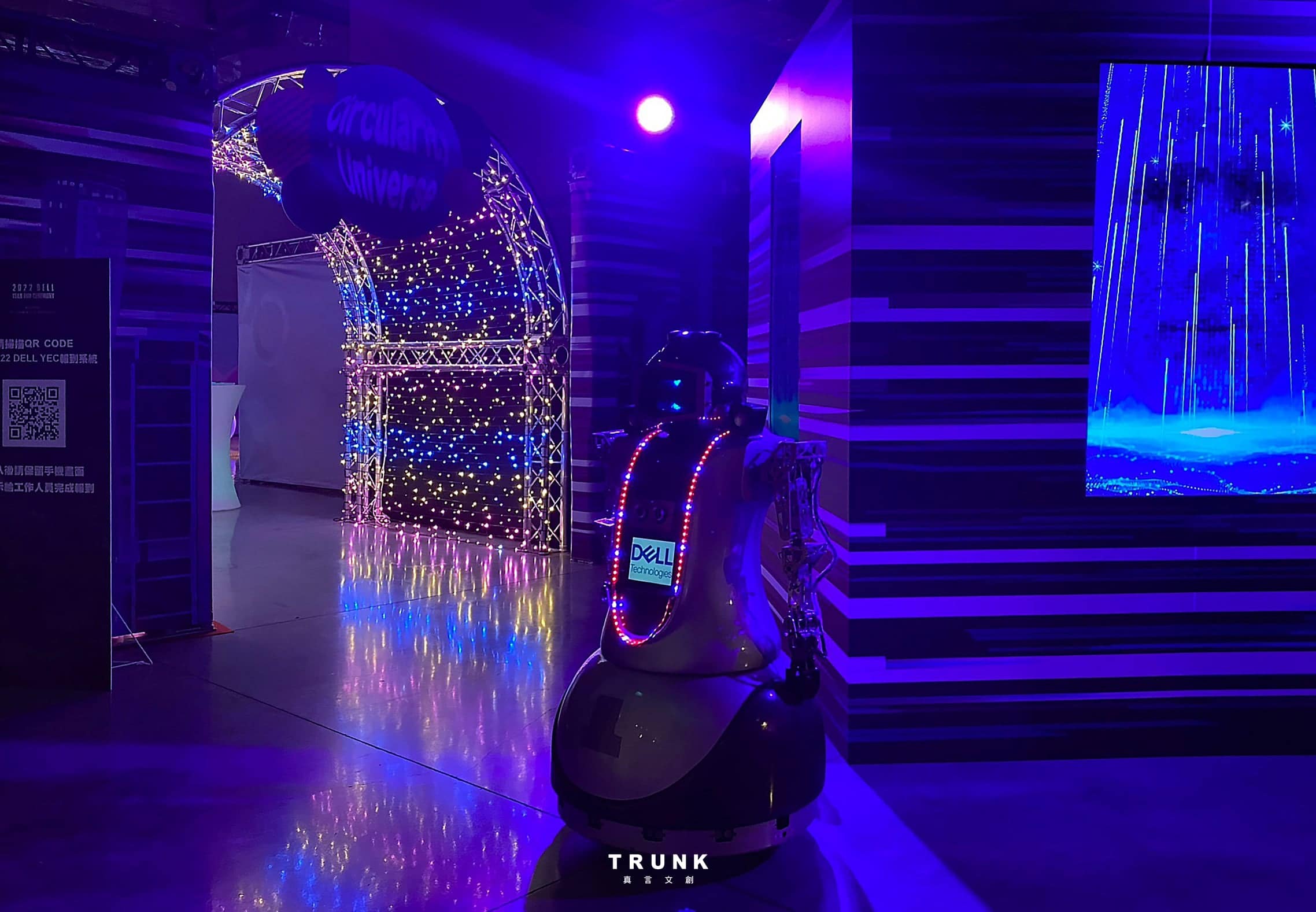 主題為多重宇宙 主視覺 報到處 入口處以AI人頭視覺搭配入場QRCODE做人流分…