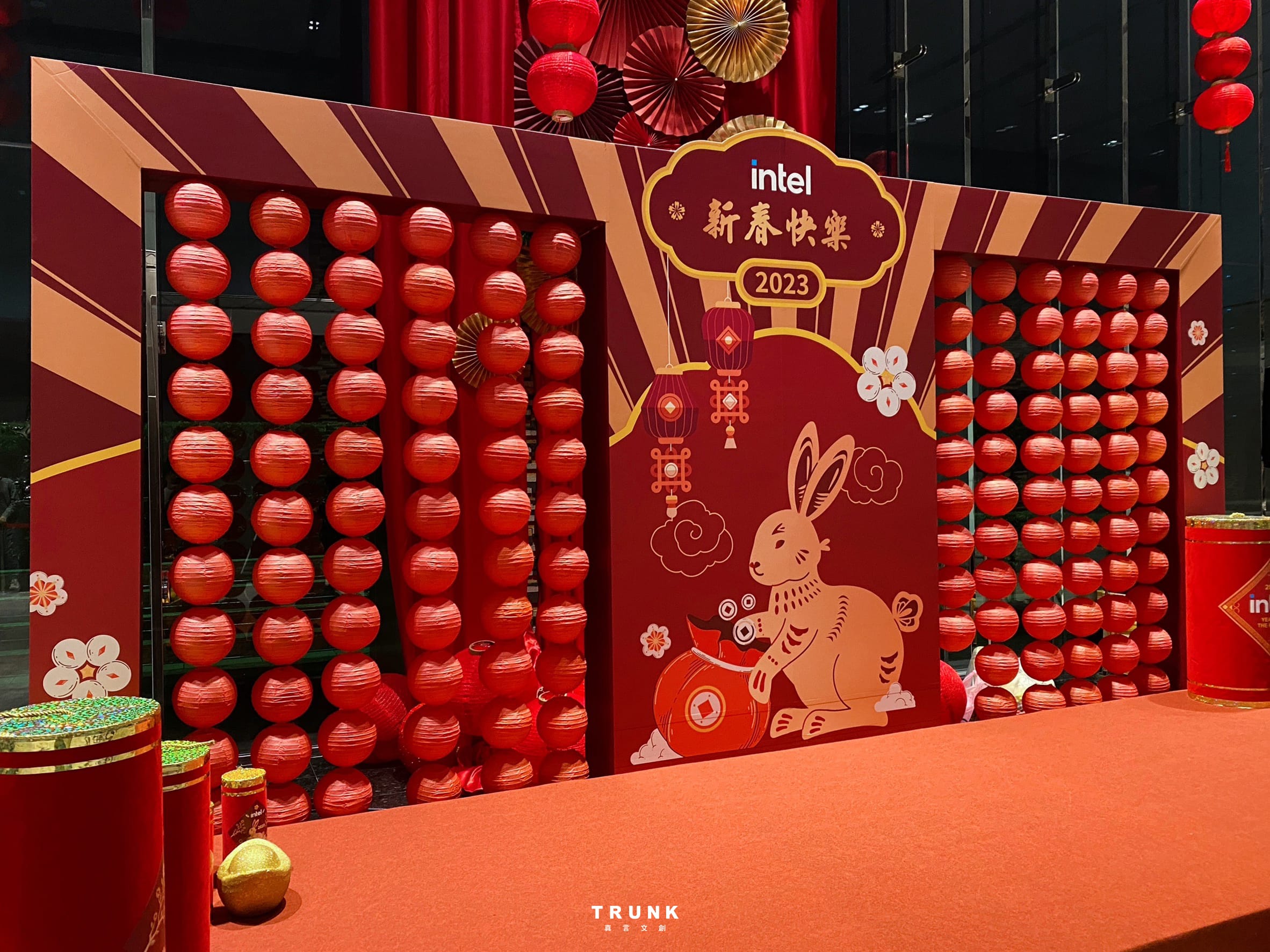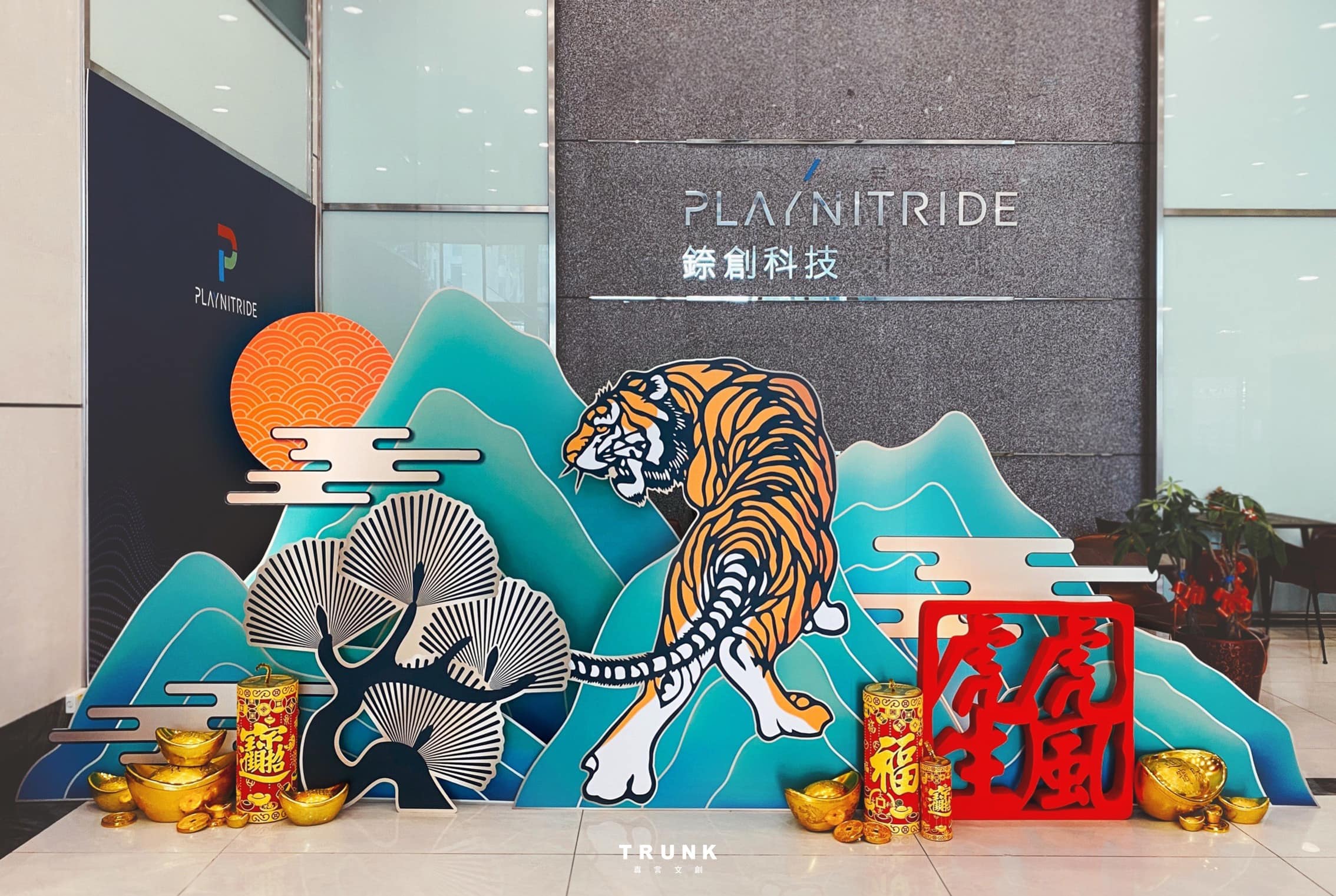 除了舊有的鞭炮等現成擺飾,虎年新春為企業大廳佈置一景「老虎上山圖」老虎上山寓意平…